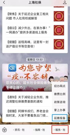 关注“上海社保”微信公众号,在底部“服务·社”栏目中选择“延缴报备”,进入“延长社会保险缴费期线上预约系统”。