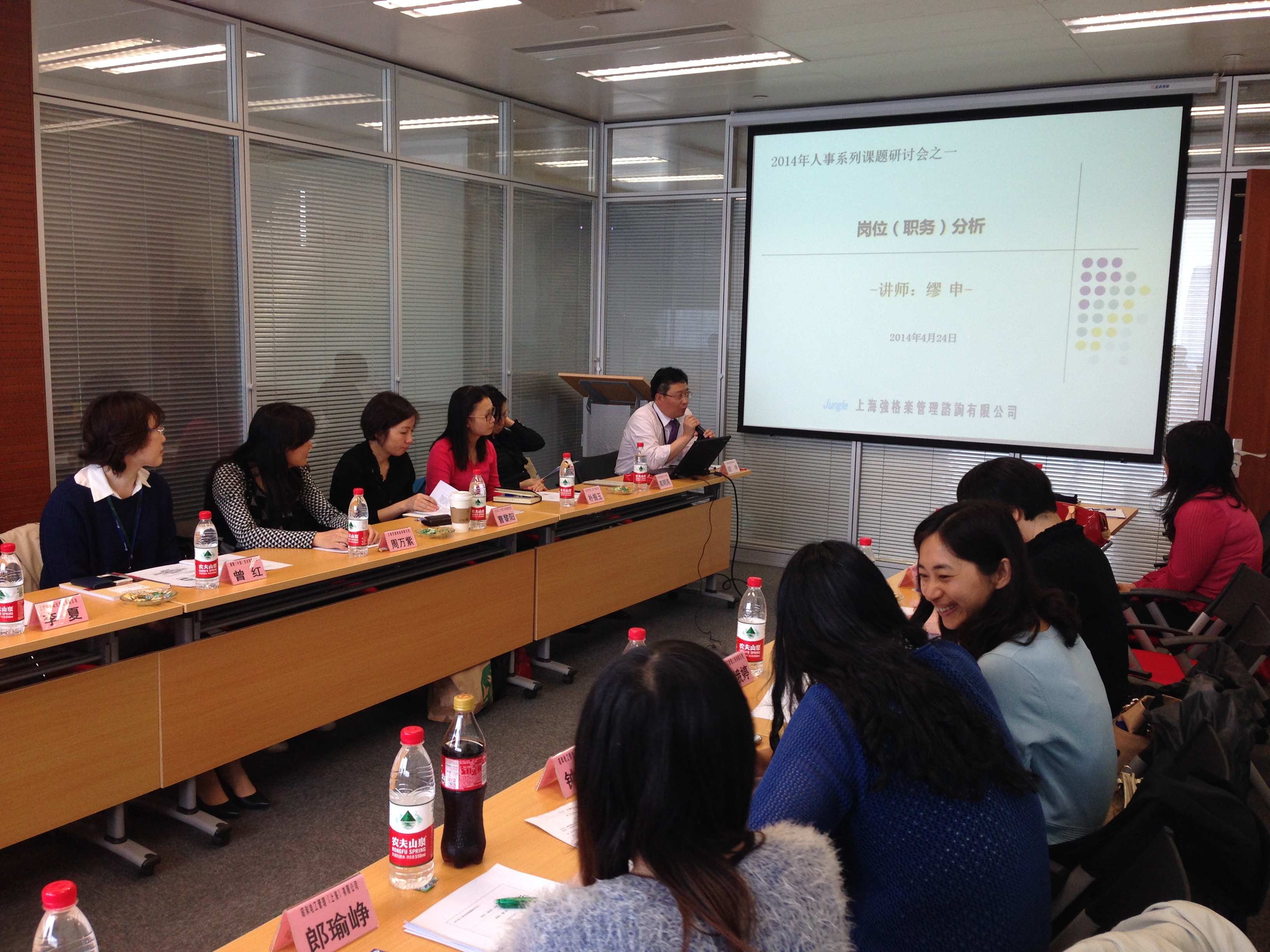 2014年4月24日(周四),在上海强格乐管理咨询有限公司的会议室举办了人力资源系列课题研讨会的第一回,主题为岗位(职位)分析。来自各大公司的20多位人力资源管理负责人参与了我们的研讨会,并就管理中遇到的职位分析相关的实际困惑,与其他参与者一起展开了积极讨论。